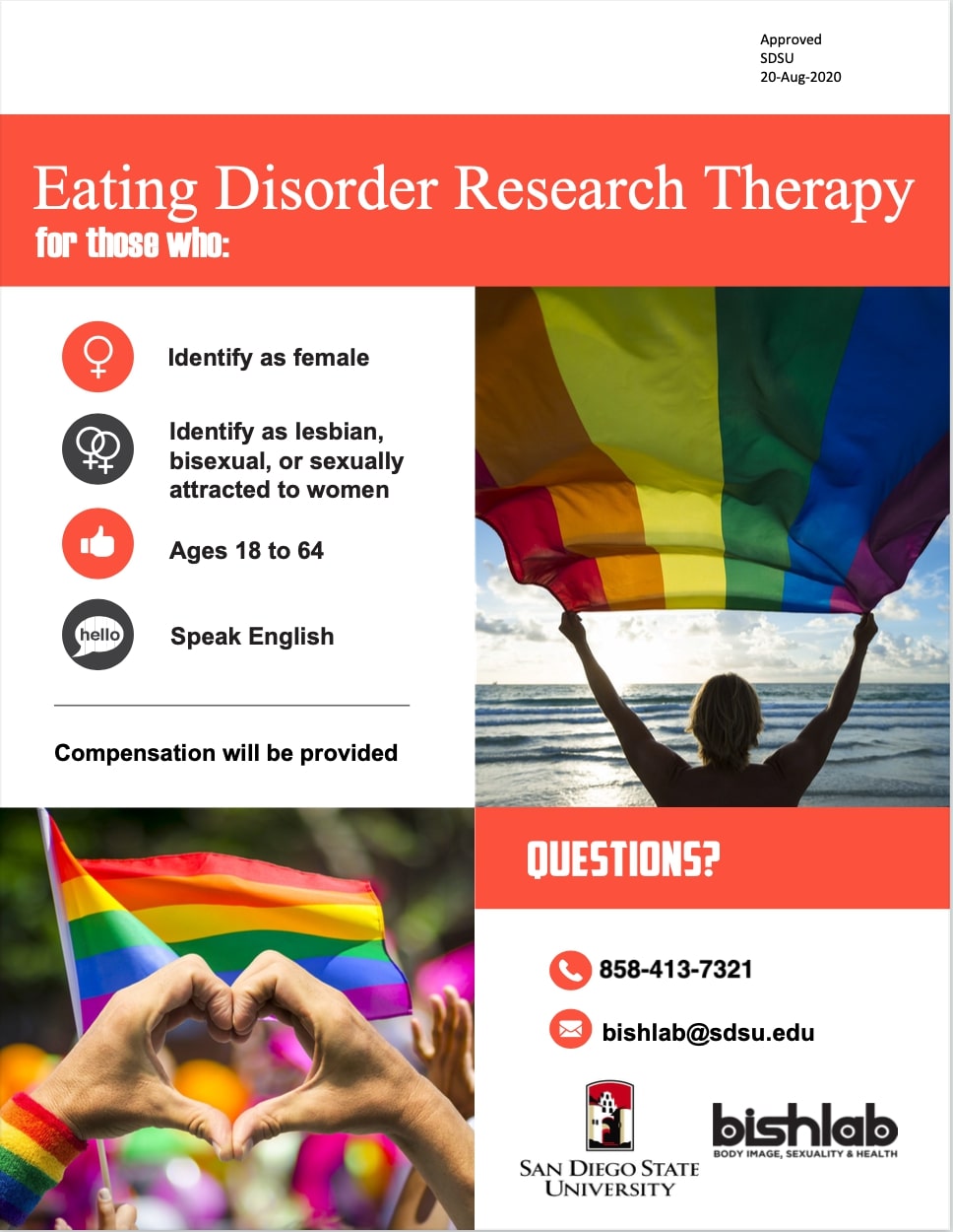 Researchers at San Diego State University Body Image, Sexuality, & Health lab (BISH) are recruiting women who identify as lesbian, bisexual, or sexually attracted to women for an eating disorder treatment research study. This study is open to women between 18-64, who speak English, and reside in California. We conduct the treatment via Zoom and compensation is provided. Please contact the BISH lab with any questions at (858) 413-7321 or